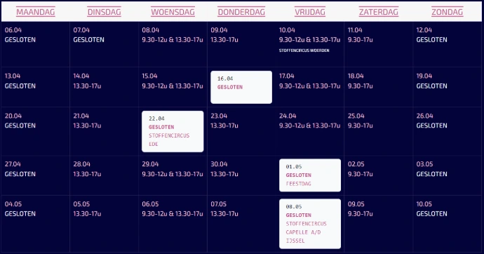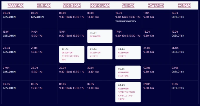 Door deelname aan verschillende markten en beurzen zullen de komende maanden onze openingsuren anders zijn. Deze zullen hieronder steeds per maand aangepast worden!